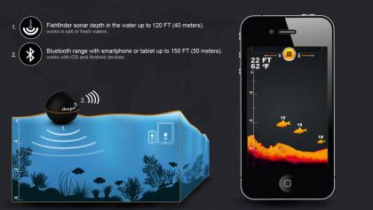 Le principe est assez simple: d'un coté vous avez votre sonde que vous jetez dans l'eau et de l'autre votre mobile pouvant être un iPhone ou un téléphone Android par exemple. La liaison entre les 2 accessoires se fait en bluetooth et promet une portée de 50m. La sonde est alimentée par batterie, le tout évidemment waterproof, et promet une autonomie de 6h (recharge par usb). A noter que celle-ci ne consomme que lorsqu'elle est dans l'eau, le contact se faisant avec cet élément (comme sur le Smartcast). Vous aurez accès à la temérature de la surface de l'eau et celle de l'air, la modélisation du fond, les échos de poissons!