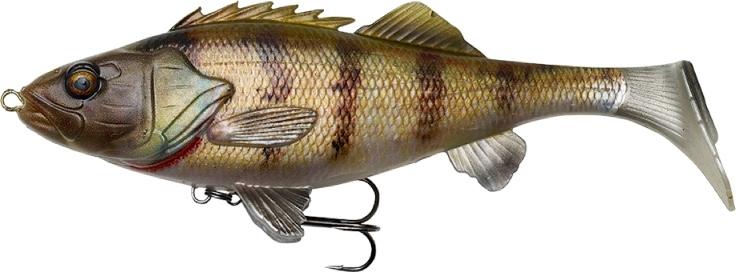 Based on a 3D Scan of a real perch with perfect details and Photo Chrome skin print and added DNA scent! The perch is in periods the main prey for Big pike and these super realistic lures will be deadly! The paddle tail make the lure rock seductively and the rattle in the tail sends out provoking clicks! The 2 smaller sizes is “ready rigged”, with the Belly treble hook mounted on a swivel, so the pike has hard time to throw the hook. The big size, is our Brilliant Linethru design, rigged with the Line thru modifier and changeable rig – the lure will slide up the trace away from the shredding teeth and the Pike cannot use the weight of the big lure to throw the hook