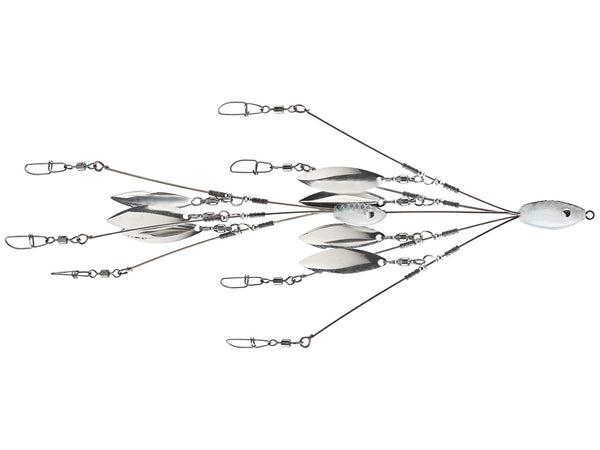 Built entirely from premium-grade components, the HogFarmer Harvester Rig is fitted with quality clevises, 80lb swivels, and super-bright willow blades, which create the illusion of a glimmering bait ball. Outfitted with a tough-as-nails camo wire, the HogFarmer Harvester Rig delivers increased strength that stands-up to hard strikes and multiple big fish. Innovative and well designed, the HogFarmer Harvester Rig provides a shimmering, multi-layered presentation that baitfish-hungry bass will love.