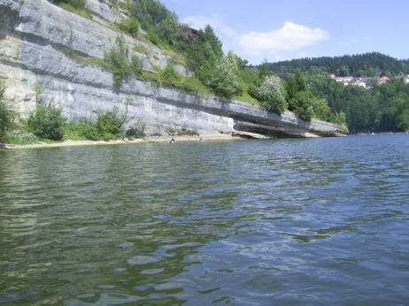 Je remonte le bras pour nous laisser dériver par le courant. Mon pote est au téléphone. On arrive à coté d'une plage de galet et la je vois mister esox qui bronze dans 10-15cm d'eau sur les galets sans rien autour. Vite je jette et... rien, le bec sans va. On insiste, il veut rien savoir