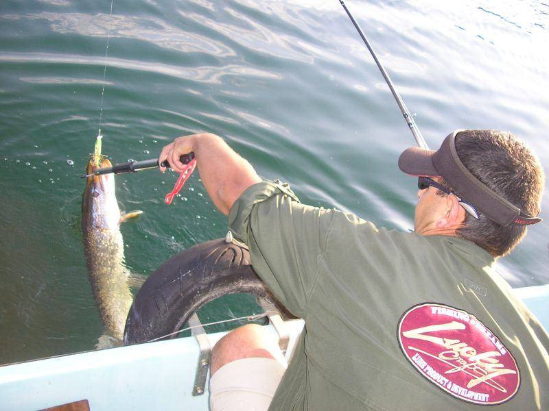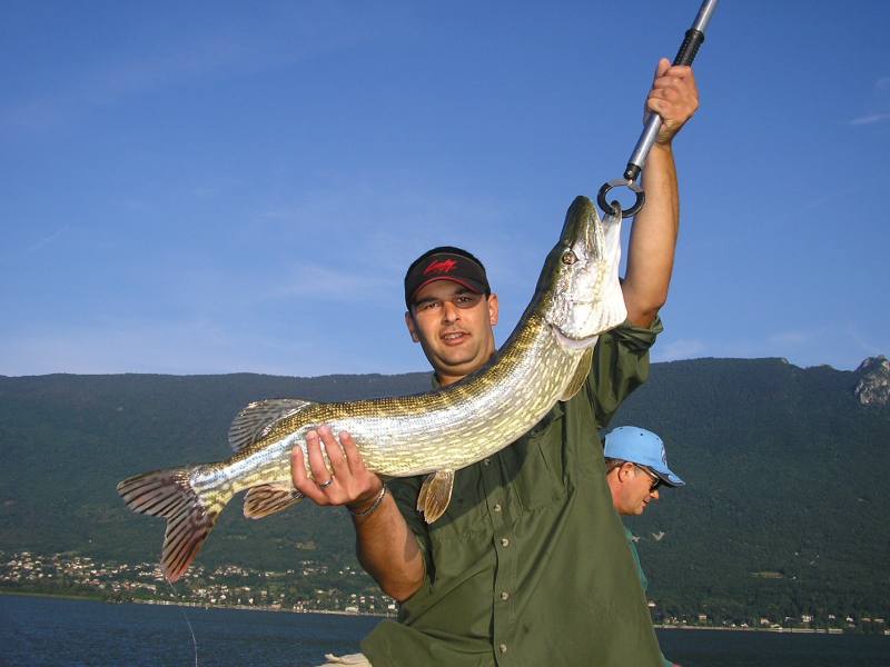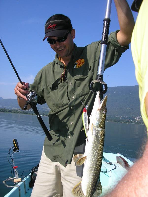Après 30 mins de prospections, les premières attaques arrivent et s'enchaînent, je loupe 3 poissons en 40 mins et je sens une légère tension qui commence à me gagner tandis que pete, lui, reste très concentré sur sa pèche et persiste avec son Staysee quand tout à coup une nouvelle attaque sur mon b'freeze se produit, je ferre comme un boeuf pour assurer le poisson et crie aussitôt "fish", Pete me regarde avec un grand sourire , ça y est, le combat commence , le poisson n'est pas très combatif jusqu'à 3m du bateau où il commence a faire de gros rushs, enfin au bout de 5 bonne minutes, on aperçoit un magnifique brochet digne de ce non, Pete glisse un "Oh my god" et Laurent me dit qu'il ne doit pas être loin de mesurer 1m.