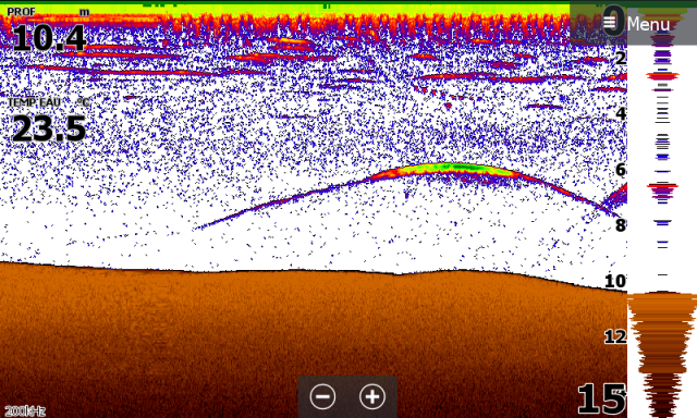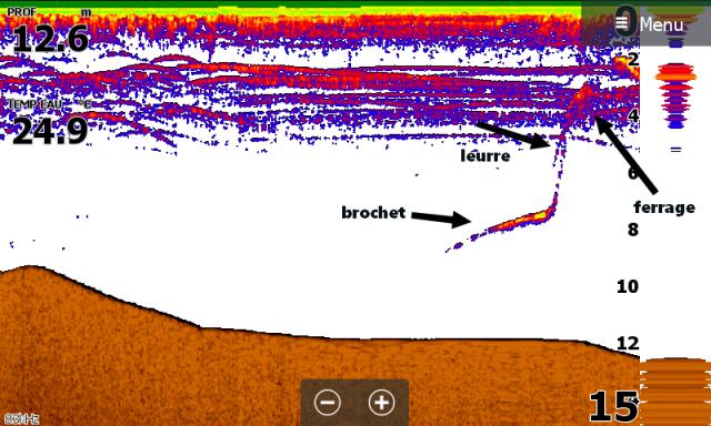 Ici le poisson est en limite de détection du cône, donc pas franchement détecté, c'est pour cela que l'écho semble "petit", pourtant c'est métré.