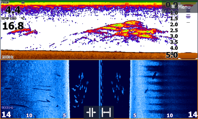 Une fois de plus de beaux échos sur la vue 2D, mais le StructurScan nous renvoie des écho plutôt rond, ce qui laisse supposé que ce sont des carpes ou des brèmes, plutôt que des silures, qui auraient des échos plus allongés.