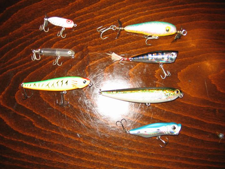 Un lot de leurres de surface (stickbaits, poppers et proppers).