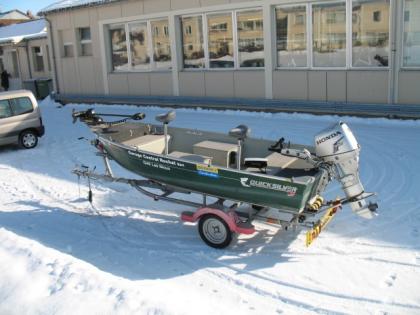 Bateau quick silver 450DLX, entièrement équipé bass-boat(vivier aèré,plateforme de pêche arrière, 2 sièges de pêche) 3 coffres de rangement, sondeur side imagine 997, sondeur avant eagle 320, moteur elect. av. minnkota 55lbs auto pilot, moteur arrière honda 4T 30CV neuf, remorque routière, support moteur(transport), bâche sur mesure, pompe de cale, 2 batteries, dispo de suite, photos sur demande, entièrement homologé. Prix: 12000 Euros\n, ou à discuter selon options. tel. 0041787376091